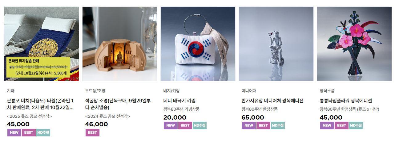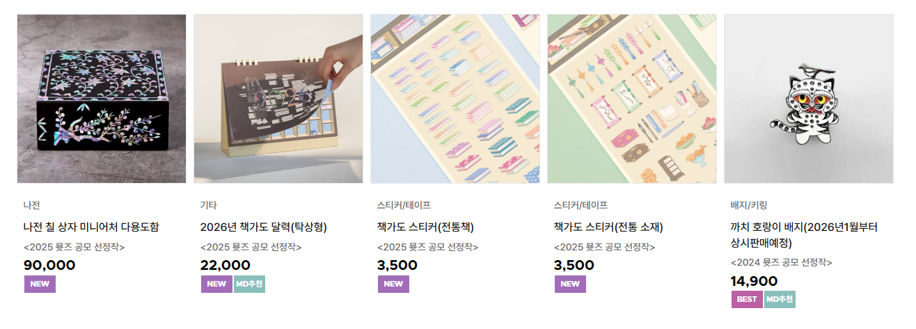 사이트에 들어가면 문구, 패션, 인테리어, 주방용품 등 카테고리가 잘 나눠져 있어서 원하는 상품을 쉽게 찾을 수 있어요. 반가사유상 미니어처, 까치 호랑이 배지, 곤룡포 타월 등 인기 굿즈는 별도 베스트 상품으로도 소개되고 있어요.