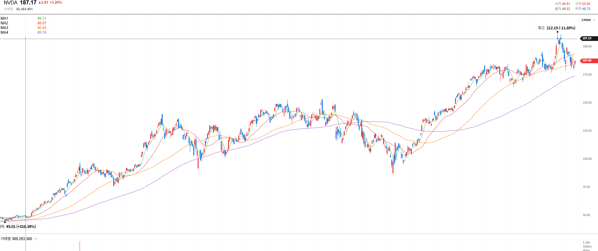 실적 발표를 앞두고 엔비디아 주가는 꾸준한 상승세를 이어가고 있습니다. 최근에는 180달러 초중반에서 등락을 반복하다가, 발표일 하루 전에는 187달러 선까지 상승했습니다. 이는 시장이 실적에 대한 기대를 미리 반영하고 있다는 뜻입니다.