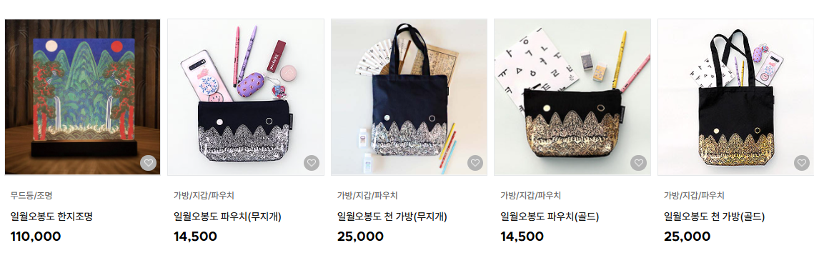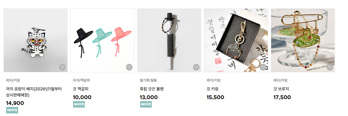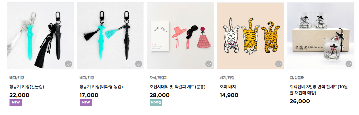 | 배지 / 키링 | 까치호랑이 배지, 갓 키링 | 캐릭터 + 전통 문양 결합 |