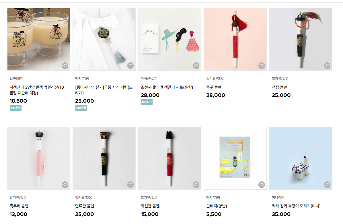 | 필기류 | 전립 볼펜, 갓끈 펜 | 전통 관모 디자인 활용 |
