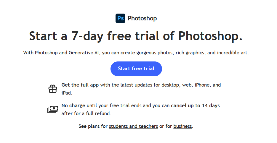 Adobe는 포토샵을 포함한 대부분의 프로그램에 7일 무료 체험판을 제공합니다. 이 체험판은 본격적으로 사용하기 전 제품이 나에게 맞는지 확인할 수 있도록 마련된 제도입니다. Adobe 입장에서도 고객이 충분히 경험한 후 만족할 경우 유료 전환을 유도하는 전략인 셈입니다.